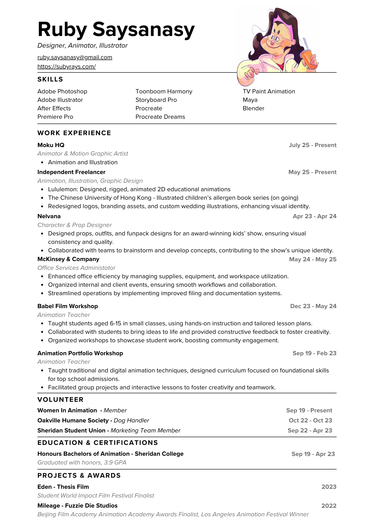 Hi! I am Ruby Saysanasy, I love being able to express my humour and view of the world through the art of animation, whether it be through the ridiculousness of my character and visual designs, or the silliness in my animation. I ultimately want to further improve my craft as both a designer and an animator to help inspire and bring joy to people who view my work!